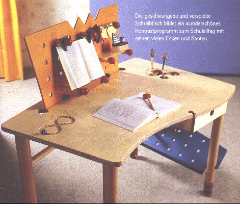 Schreibtisch aus Birkensperrholz und Buche massiv (Breite 120 cm x Höhe 70 cm x Tiefe 79 cm) Die senkrechte Holzwand mit einem Ablageboden, acht langen und vier kurzen Holzpins sowie zwei Korkstreifen gehört zur Grundausstattung. Krimskramsfach, Ablage und Kugelspiel sind integriert. Mit dabei sind außerdem zwei Buchhalterungen, Monitorplatte und Tastaturhaltestangen. Die Tischhöhe läßt sich scheibchenweise mit fünf 2 cm dicken Holz-Pucks regulieren. Best.-Nr. S98004 Preis: auf Anfrage |
